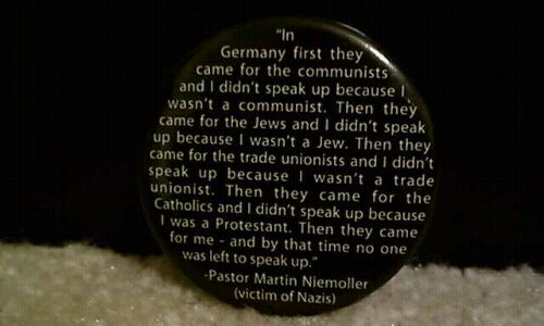 They came first for the Communists, and I didn’t speak up because I wasn’t a Communist. Then they came for the trade unionists, and I didn’t speak up because I wasn’t a trade unionist. Then they came for the Jews, and I didn’t speak up because I wasn’t a Jew. Then they came for me and by that time no one was left to speak up.