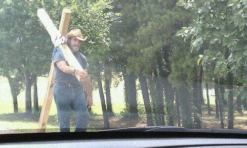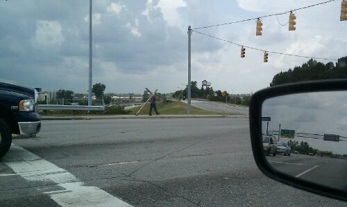 This last Saturday I was on Montague Avenue in North Charleston heading to the Panera Bread. For the second time this year, I drove past a man walking down the sidewalk with a cross over his shoulder. I wasn’t in a hurry so I turned around to get some pictures. I was close enough when I took the second picture for the man to notice me. He waved as I drove past. While this is something of an odd occurrence, it’s not as outlandish as it seems. My own church carries a cross through the city of Goose Creek during their Good Friday service to remember the events of the Crucifixion. In many parts of the Christian community, the phrase “carrying your cross” is a metaphor for being a disciple and following the teachings of Jesus. I’m still curious though. How long has this man felt called to carry his cross? Is he the only one or are there others out there walking with him in North Charleston? What are your thoughts? Are actions like this a sincere expression of faith, or do they serve to alienate and separate Christians from the communities they are to serve?